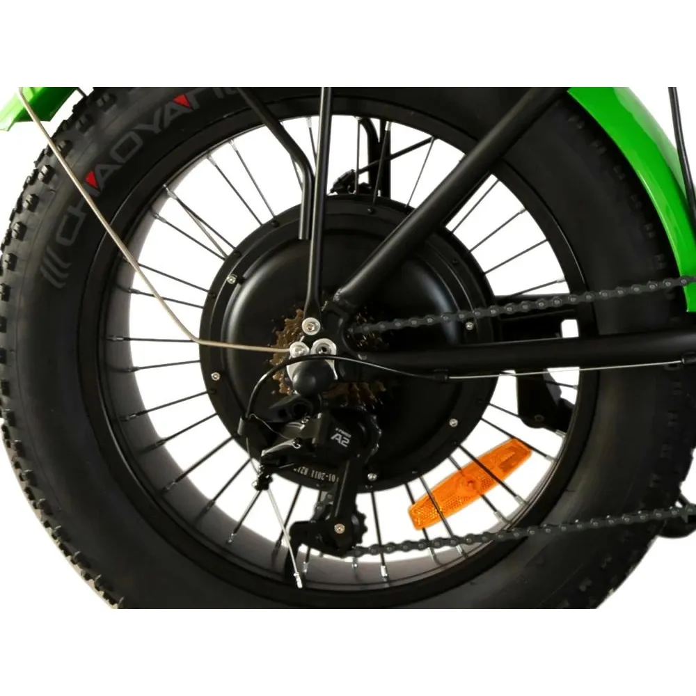 При мощности движка 1500 Вт и емкой АКБ максимальная скорость может достигать 47 км/час, запас хода – до 100 км. Увеличить пробег можно за счет перехода на режим педалирования. 20-дюймовые колеса не знают препятствий. Надежно сцепляются с грунтовым и асфальтовым покрытием. Накатистые и скоростные.