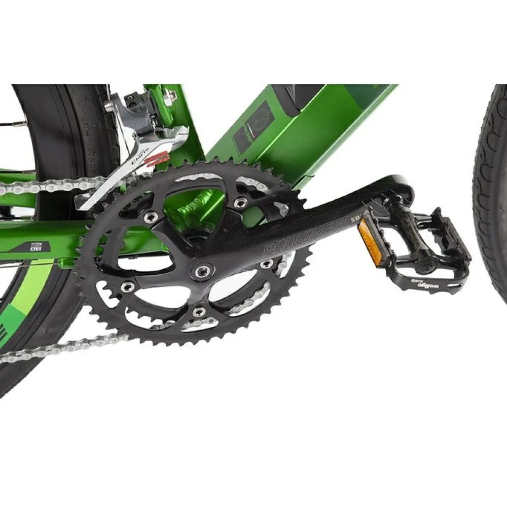 Райдер быстро наберет скорость 25 км/час благодаря мощному движку 350 Вт (цепного типа мотор/колесо). Увеличить скоростной показатель можно за счет перехода на педальный режим. Литий-ионный аккумулятор вмонтирован в раму и имеет емкость 10,4 Ач (напряжение 36 В). Запас хода составляет 65 км, время зарядки 6 часов в бытовых условиях.