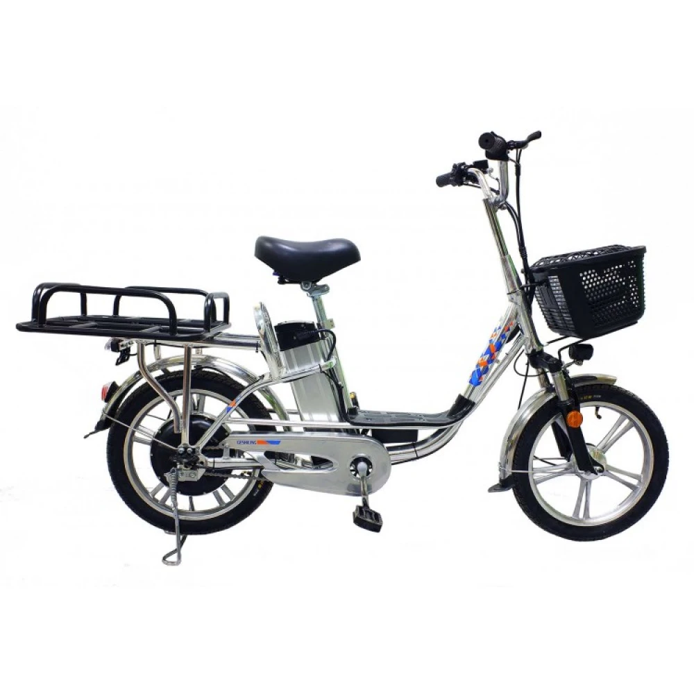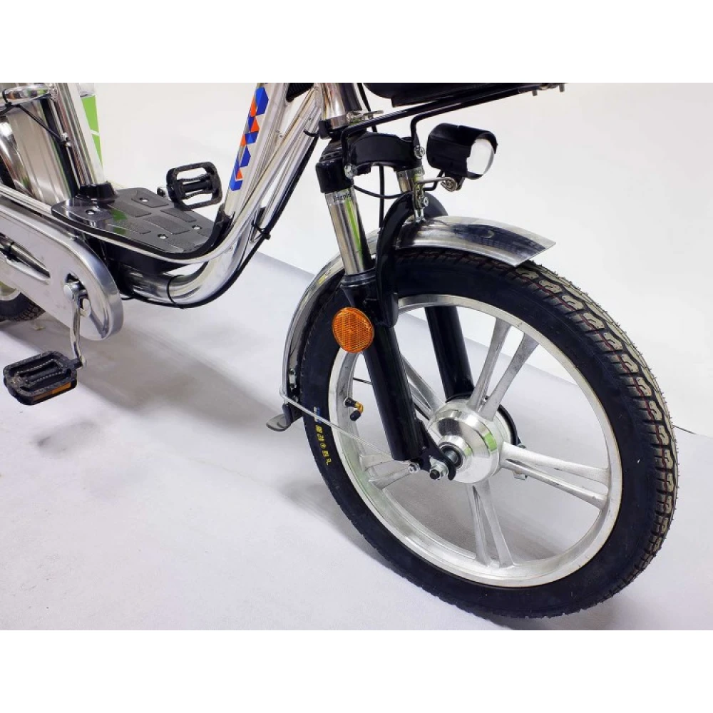 Электровелосипед весом 32 кг имеет максимальную грузоподъемность 180 кг. Техника представлена нескладной конструкцией, изготовлена из прочного и облегченного алюминия. Мощность двигателя 350 Вт позволяет в короткие сроки развивать максимальную скорость 35 км/час. Комфортное движение на любой дороге обеспечивают оригинальные передние амортизаторы. Аккумуляторная батарея рассчитана на 700 циклов заряд/разряд, позволяет преодолевать расстояние 50 км на одном заряде. Задние гидравлические тормоза и передние барабанные продуманы производителем для обеспечения полной безопасности поездок.