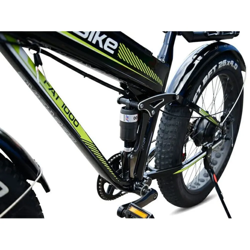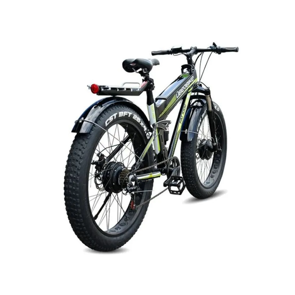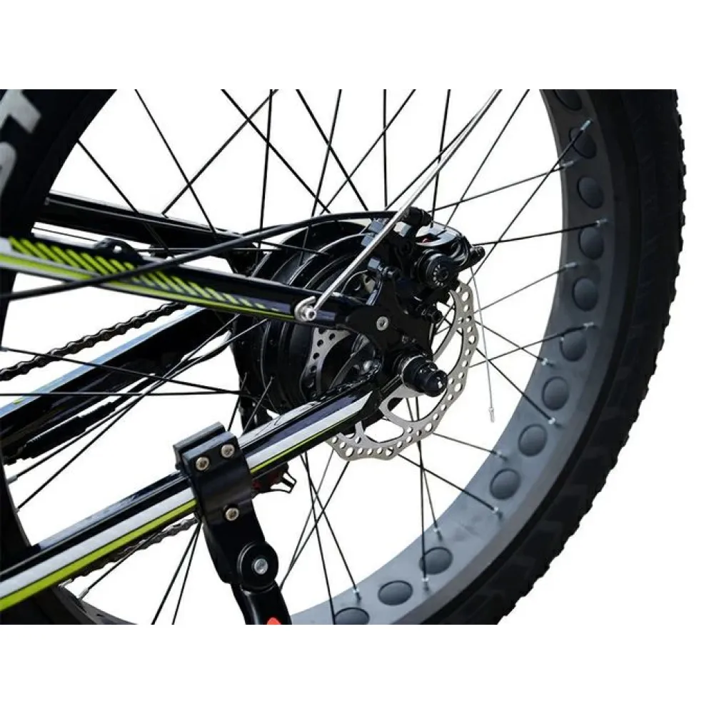 Фэтбайк оборудован двумя электромоторами в сумме выдающие 1000 Вт благодаря подаче питания от емкой батареи. АКБ быстро снимается при необходимости и имеет короткий цикл зарядки всего 6-8 часов, емкость также позволяет проходить на одном заряде до 30 км. Тип привода полный цепной гарантирует разгон за секунды до 30 км/час. Сидение средней жесткости задумано для полного комфорта пользователя.